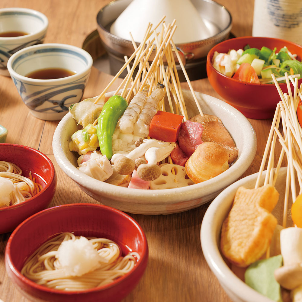 夜は天ぷら串の食べ放題、”天串バイキング”を営業しています。一口サイズの串をご自分のテーブルで揚げながらアツアツをお召し上がりください。
