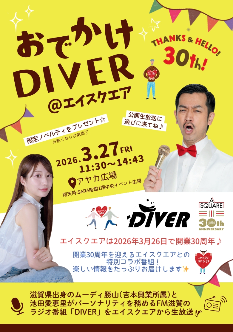 滋賀県出身のムーディ勝山(吉本興業所属)と、池田愛恵里がパーソナリティを務めるFM滋賀のラジオ番組「DIVER」をエイスクエアから生放送!!